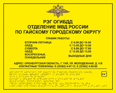 Тактильная информационная вывеска с режимом работы и шрифтом Брайля Универсальное решение для информационной доступности Представляем современную тактильную табличку с режимом работы организации, разработанную с учетом потребностей всех категорий маломобильных граждан. Вывеска сочетает в себе несколько способов передачи информации, что делает её максимально эффективной для людей с различными особенностями зрения. Преимущества продукта: • Многофункциональность – информация доступна для всех категорий МГН • Антивандальное исполнение – надежная защита от механических повреждений • Всепогодность – устойчивость к любым погодным условиям • Универсальность – подходит для внутреннего и наружного размещения • Долговечность – прочный материал и качественное исполнение Способы получения информации: • Для владеющих шрифтом Брайля – тактильное чтение рельефно-точечного шрифта • Для не владеющих шрифтом Брайля – осязательное восприятие выпуклых букв и символов • Для слабовидящих – визуальное восприятие контрастных элементов Технические характеристики: • Габариты: 500х600 мм • Высота тактильного слоя: 0,8 мм • Толщина основы: 3 мм • Материал: композитная алюминиевая панель • Условия размещения: универсальное (улица/помещение) Соответствие стандартам: Изделие полностью отвечает требованиям современных нормативных документов: • СП 59.13330.2020 «Доступность зданий и сооружений для маломобильных групп населения» • СП 136.13330.2012 «Здания и сооружения. Общие положения проектирования с учетом доступности для маломобильных групп населения» • ГОСТ Р 56832-2020 «Шрифт Брайля. Требования и размеры» • ГОСТ Р 51671-2020 «Средства связи и информации технические общего пользования, доступные для инвалидов. Классификация. Требования доступности и безопасности» Почему стоит выбрать нашу табличку: • Комплексный подход к информированию различных категорий граждан • Высокое качество материалов и исполнения • Долговечность и надежность конструкции • Соответствие всем требованиям законодательства